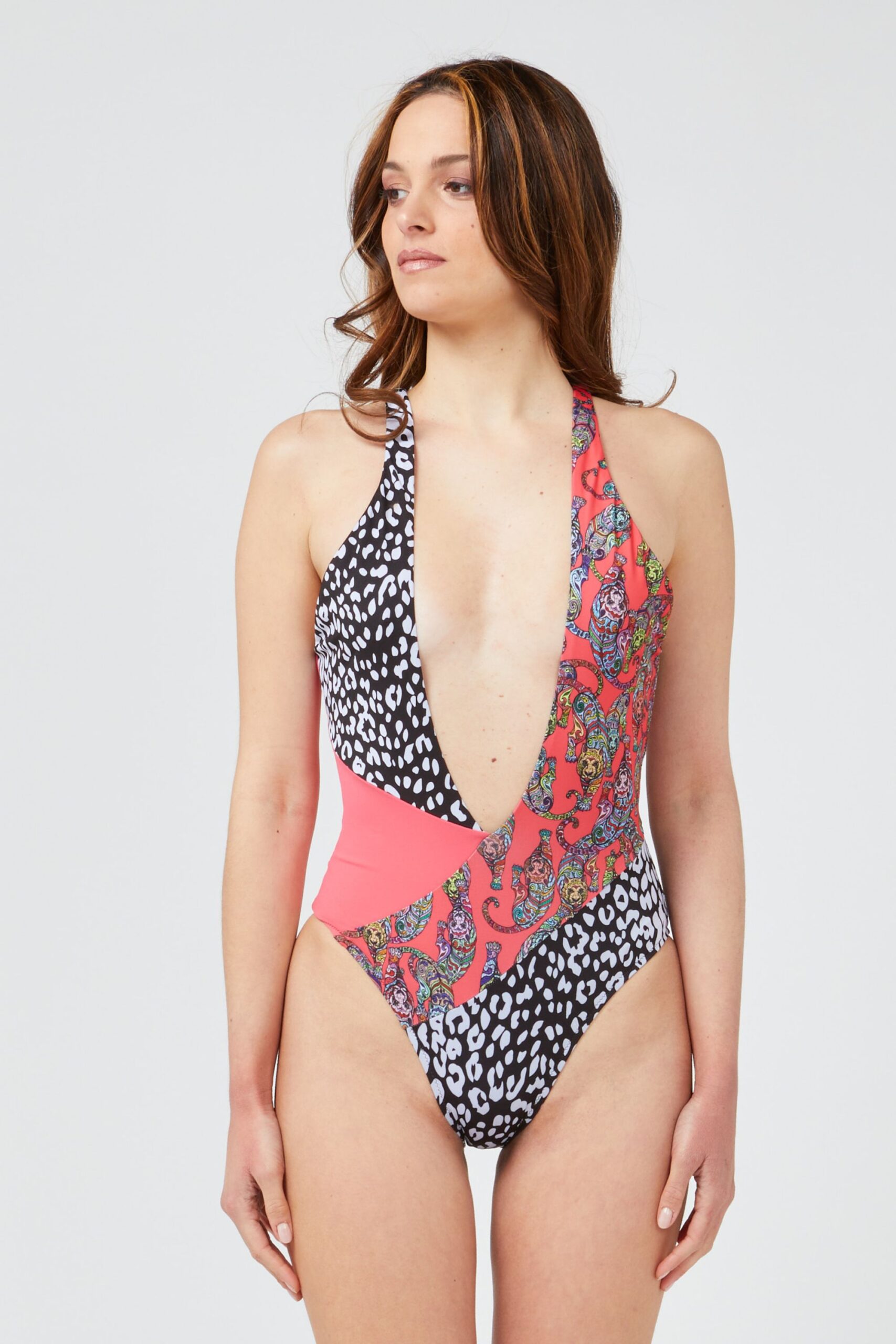 Body Swimsuit. Print With 3 Different Patterns. Wide Front And Back Neckline.