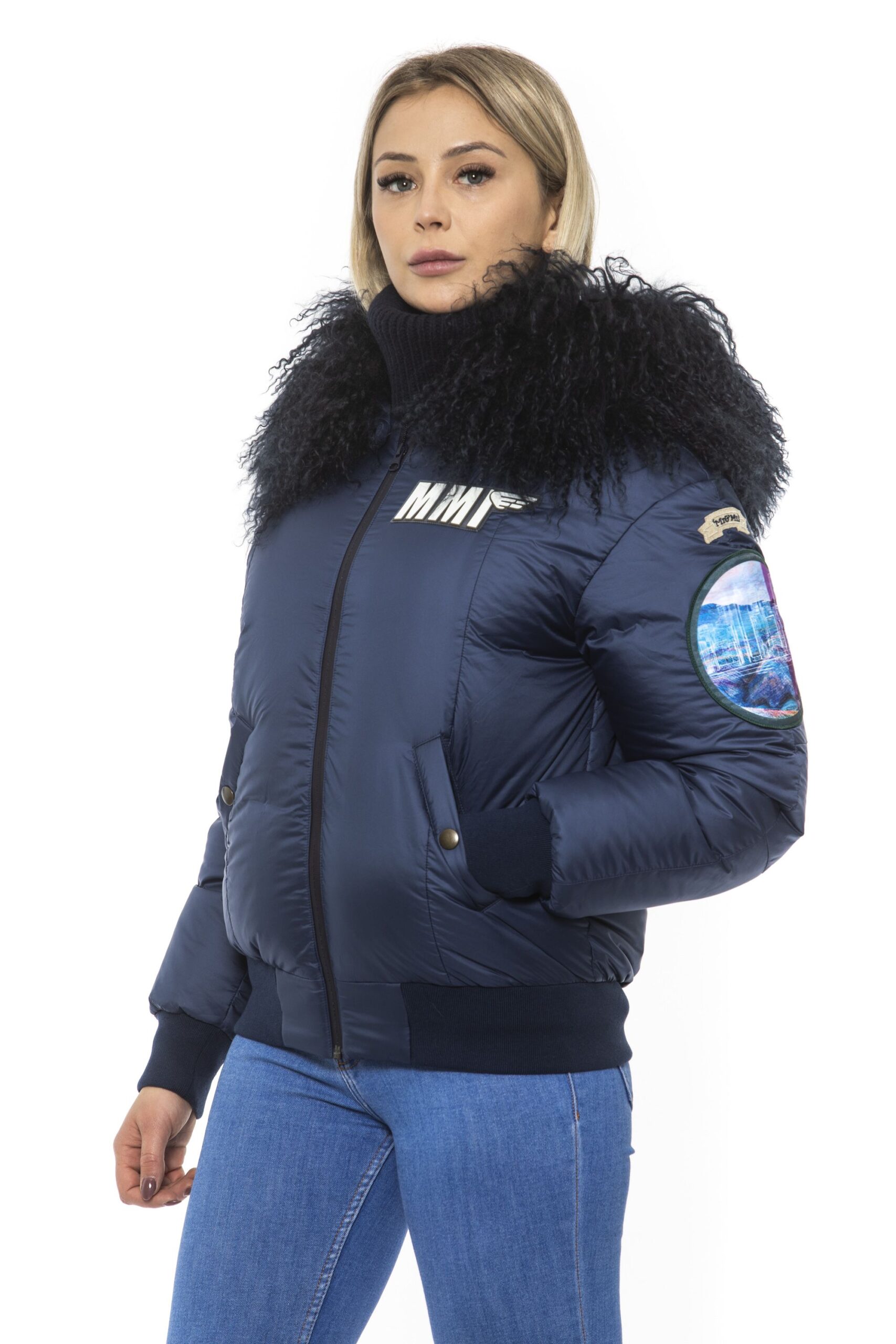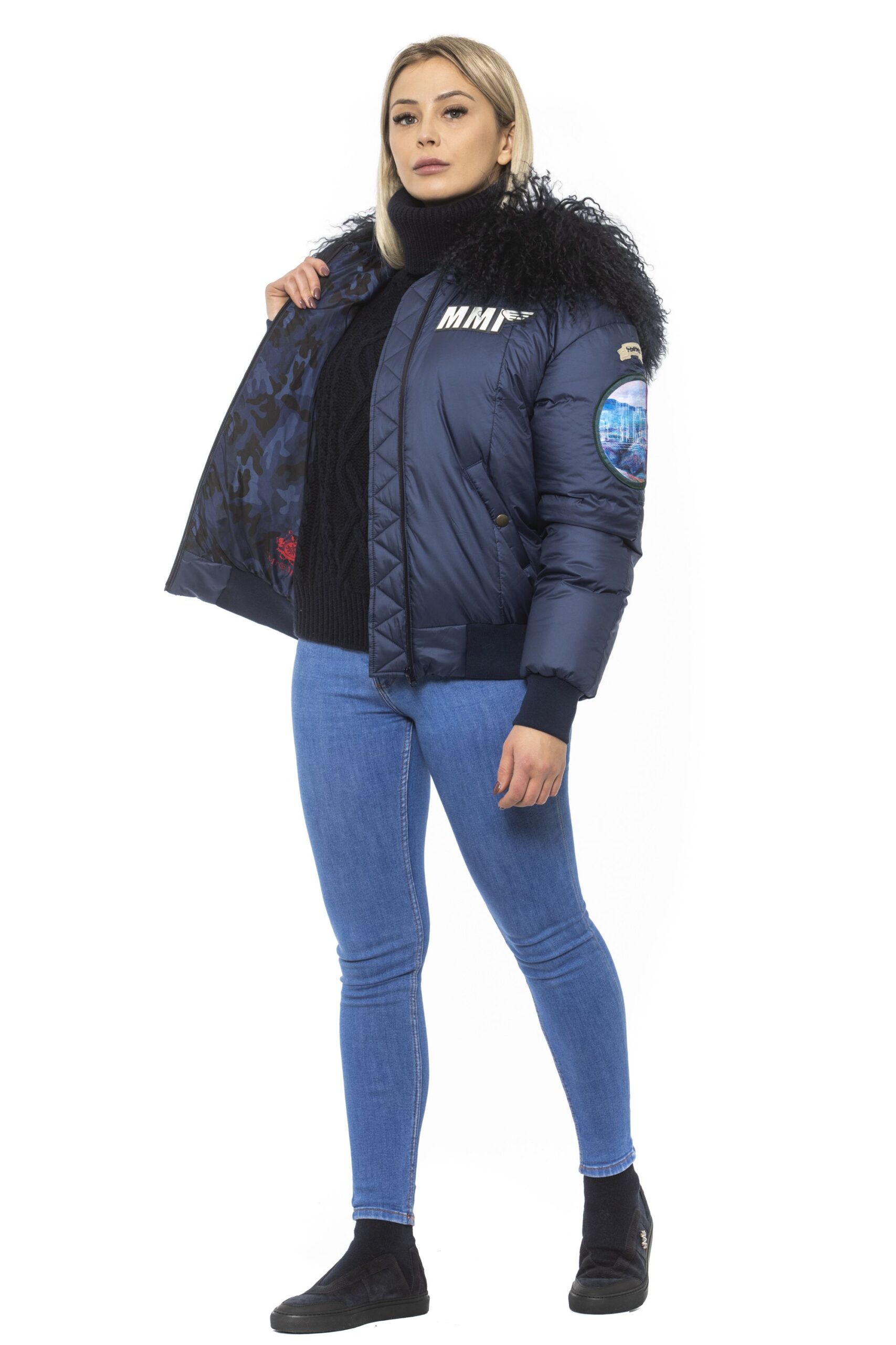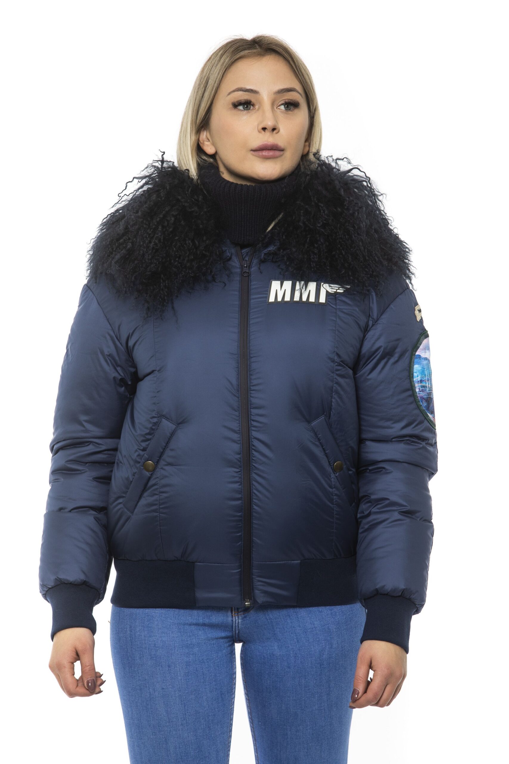Woman Bomber. Zip Closure. Embroidered Patches. Hood With Removable Fur. Two Front Pockets.