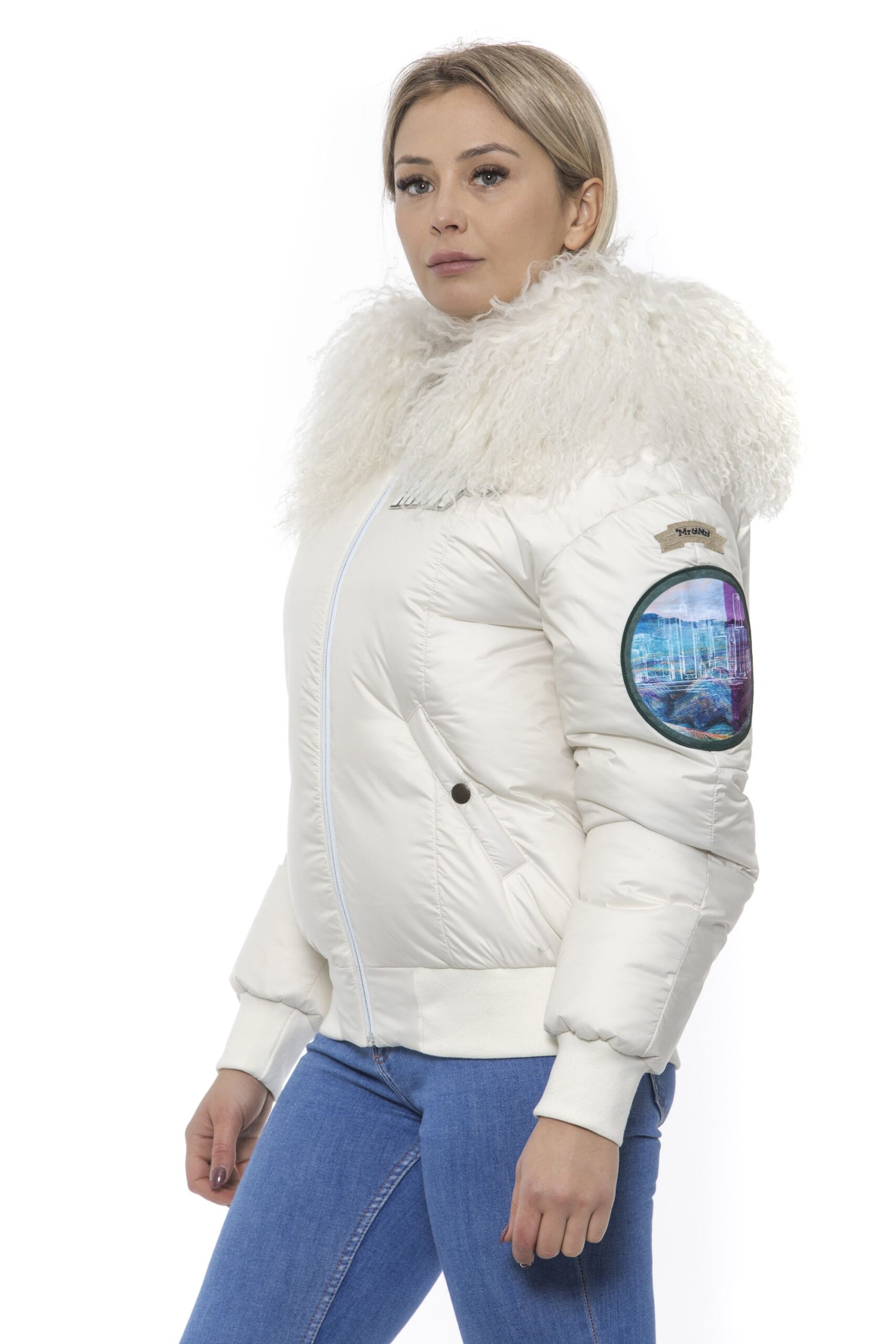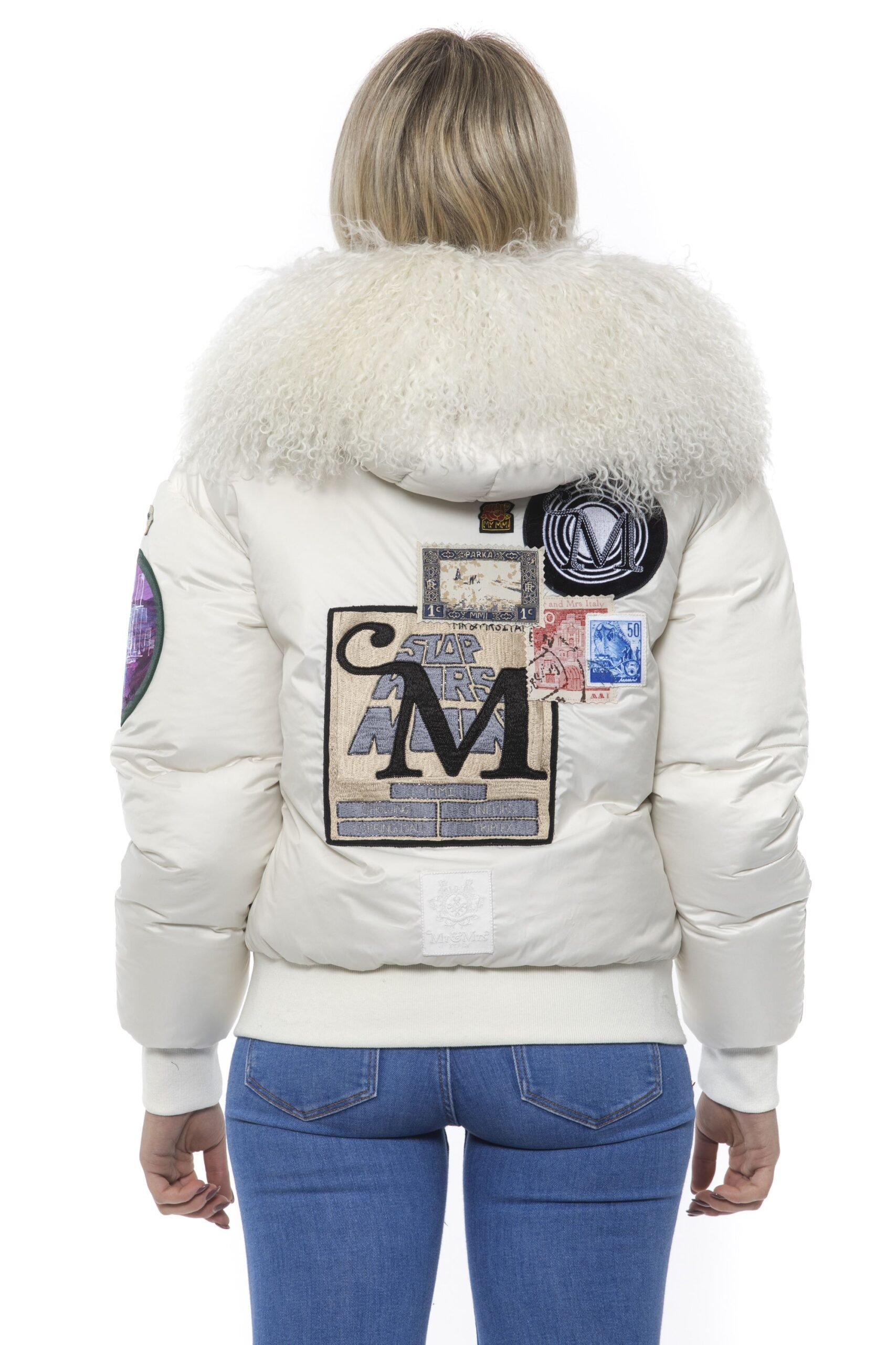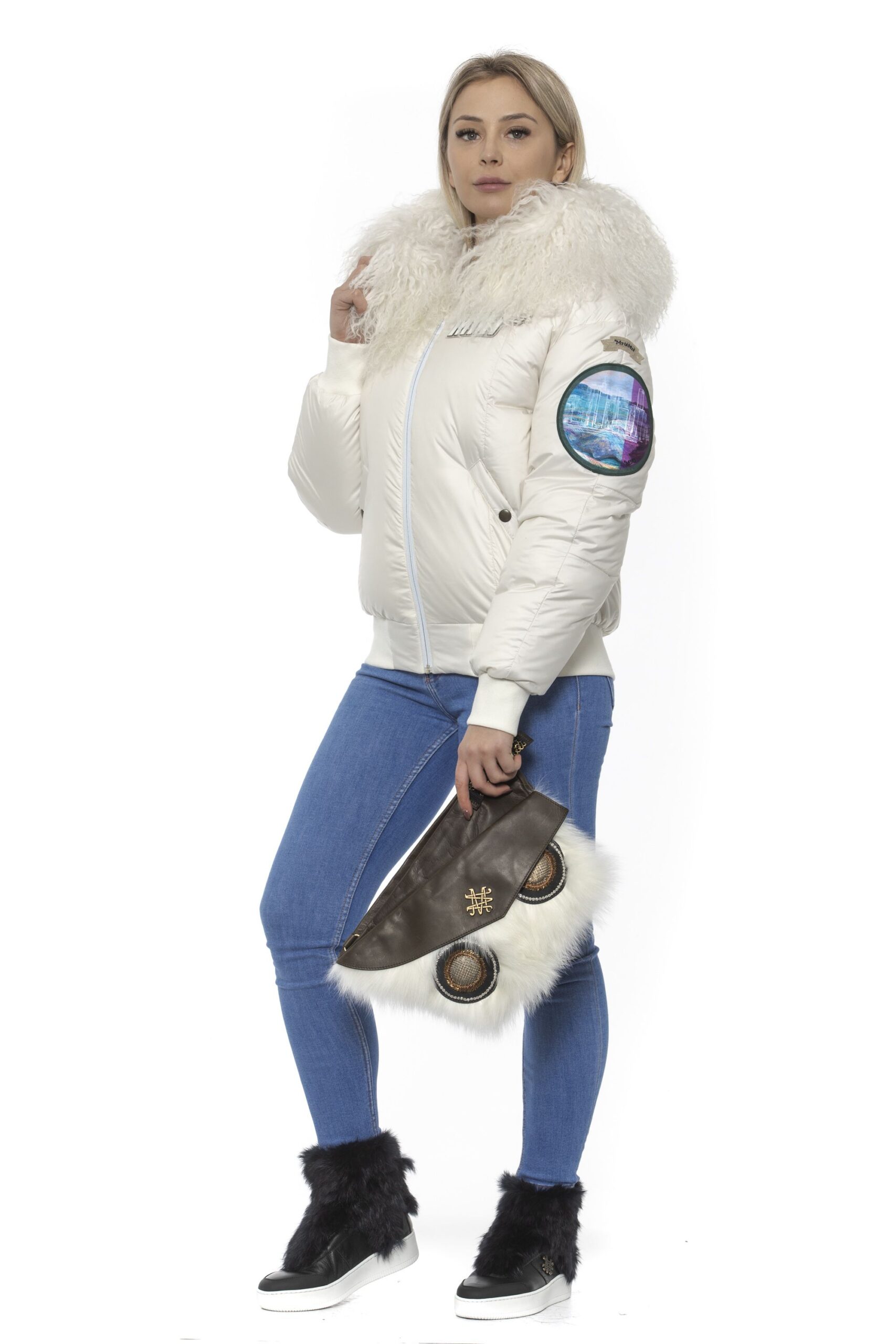 Woman Bomber. Zip Closure. Embroidered Patches. Hood With Removable Fur. Two Front Pockets.